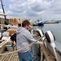 C’est pourquoi, nous Trigorioù, représenté par Pierre-Yves, à l’occasion de ce chantier exceptionnel et rare, nous avons modestement apporté notre contribution. Nous avons participé, en observant, en recueillant ce savoir faire en acte, en mettant la main à la pâte, ou du moins la main au suif pour commencer. Nous avons bossé – au propre dans le lexique maritime, comme au figuré – réalisé des nœuds de ride par ci, une épissure par là, des amarrages plats sur ride et sur câble, et surtout offert une paire de bras et des mains supplémentaires pour assister le Maître-gréeur et l’équipage dans ces opérations à la fois délicates et intenses.