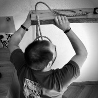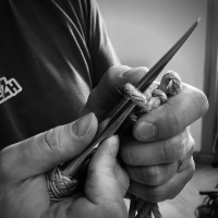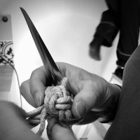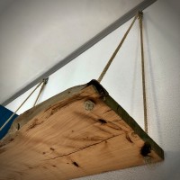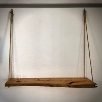 Cette étagère montée sur cordes épissées avec pomme de tireveille s’intègre dans un projet d’aménagement de cuisine/salon (en cours de réalisation) pour un appartement à Saint-Malo.