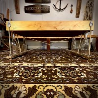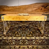 Table basse alliant le caractère imposant et massif du billot et la transparence/translucidité du verre blanc, ce qui confère à l’ensemble une impression de légèreté.