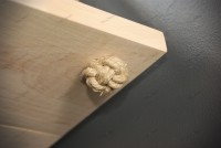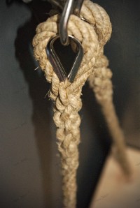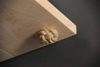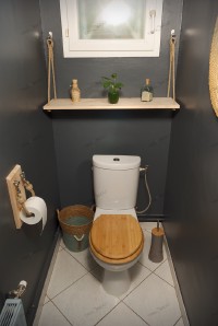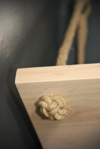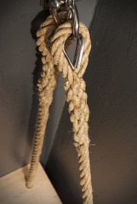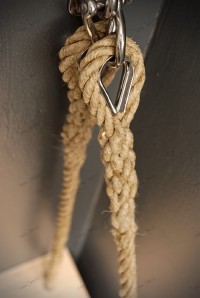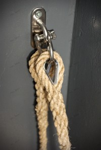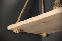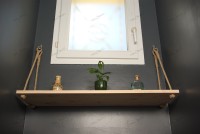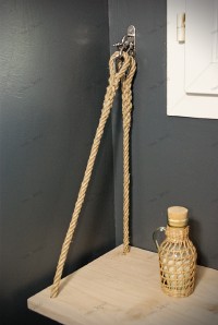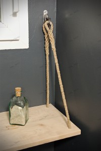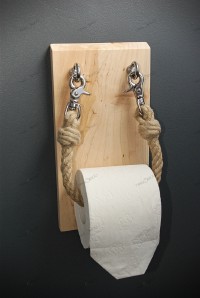 Étagère montée sur cordes épissées avec pomme de tireveille accompagnée d’un dérouleur à papier toilette.