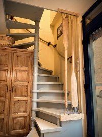 Et en guise de touche finale : une paire d’avirons suspendus vient compléter cet aménagement… Le défi était de combler cette ouverture en bas d’escalier sans empiéter sur la faible largeur de celui-ci (70cm), sans non plus avoir une sensation d’enfermement…