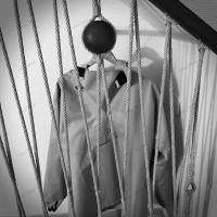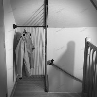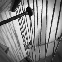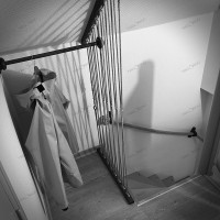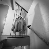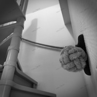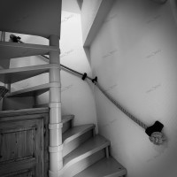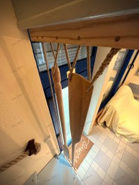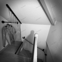 Nous avons imaginé l’aménagement d’un petit espace penderie en haut de l’escalier, fermant ainsi le vide en haut de l’escalier, tout en étant ouvert et laissant passer la lumière. Vous pourrez remarquer l’amarrage de la barre directement dans le cordage vertical, ainsi que la ride en cordage reprenant le principe de tension des haubans de mâts.