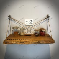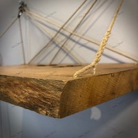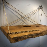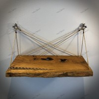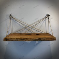 Cette étagère est suspendue grâce à des cordages avec une structure inspirée des gréements de navires à voiles. Cette technique permet, contrairement aux suspensions simples, d’obtenir une étagère stable notamment contre les déplacements latéraux.