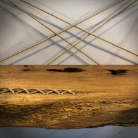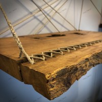 Dans un esprit naturel et souhaitant conserver le caractère brut du plateau de bois massif avec ses nœuds évidés, la gerce a été mise en valeur grâce à un laçage de chanvre.